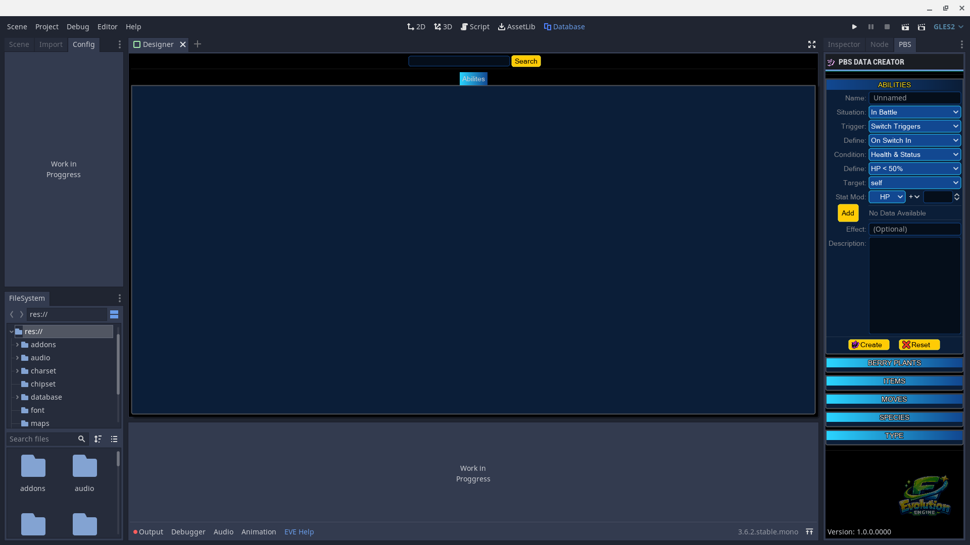 Database (Top Middle): This is where your files will be able to be seen and viewed. Like any Pokemon game, you may wanna view some of the files you created. though limited to just abilities, we do plan to increase it as we go .